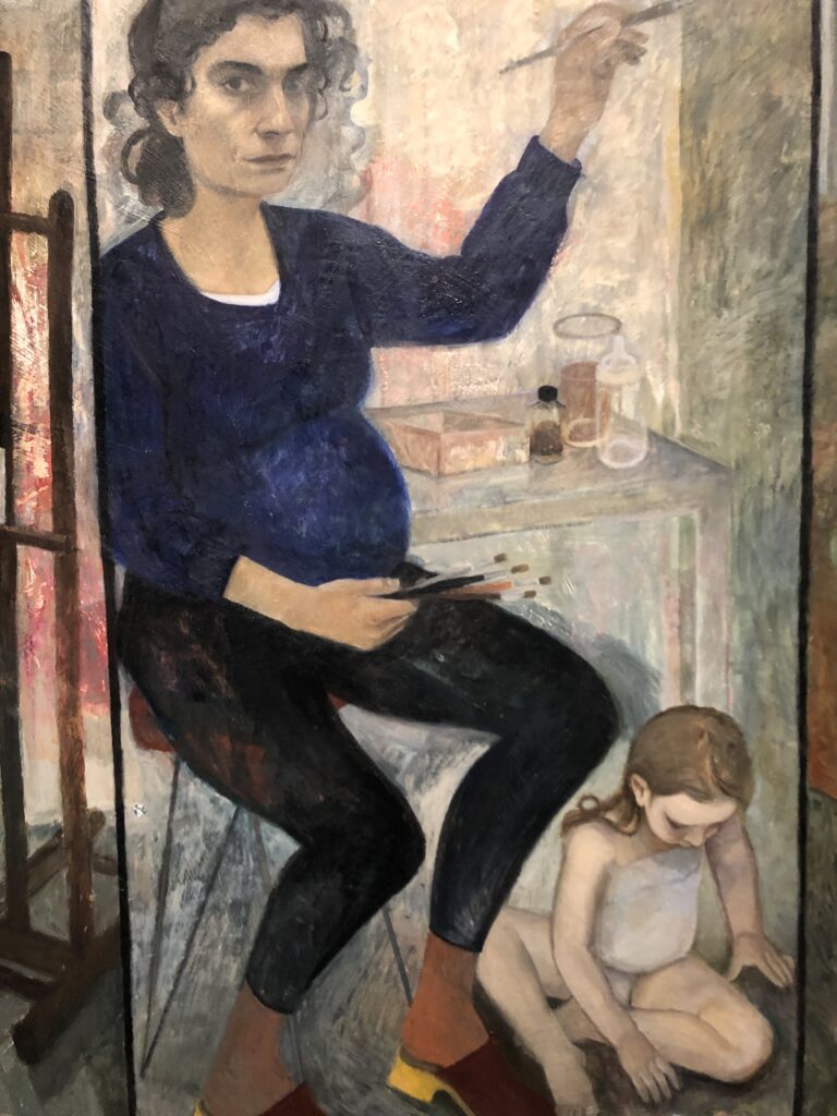 Apolonia Sokol présente « Stamina », un triptyque monumental qui prend place dans les collections permanentes du Petit Palais (gratuites!). Elle interprète « Le Sommeil » de Gustave Courbet, en mettant en scène ses assistantes dans l’atelier. Une façon engagée et politique de mettre en lumière ces femmes qu’on ne voit pas toujours. L’atelier est également le décor de l’autoportrait réalisé par Nathanaëlle Herbelin, intitulé « Manifestation pour une deuxième grossesse ». L’artiste s’y représente enceinte, avec sa première fille. Héritière des Nabis, elle privilégie dans son travail les aplats de couleurs douces et les scènes d’intérieur. Cette intimité frontale avec la femme artiste ET mère fait du bien à voir. Ce genre de représentation nous a trop souvent été confisqué par le passé.